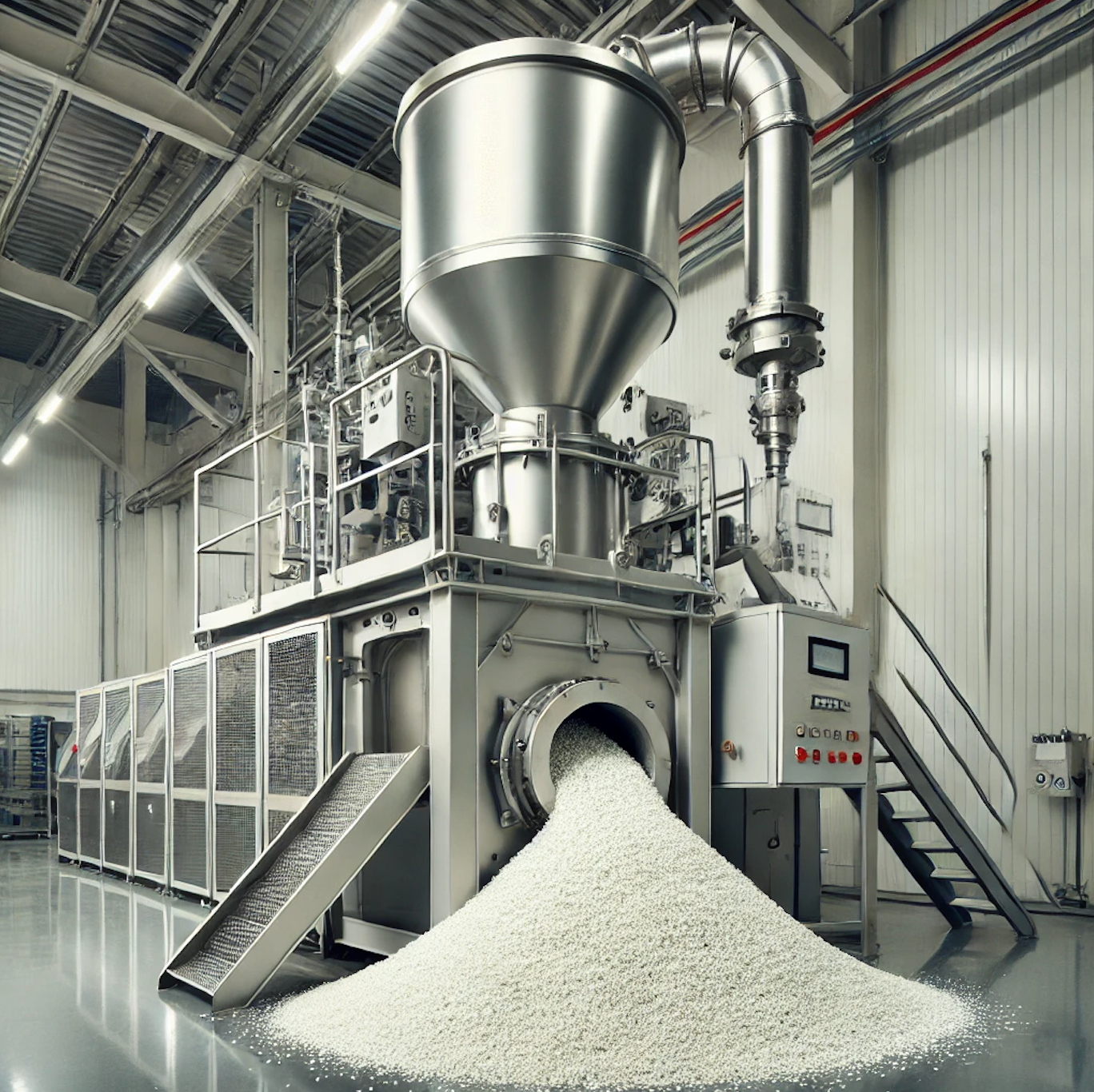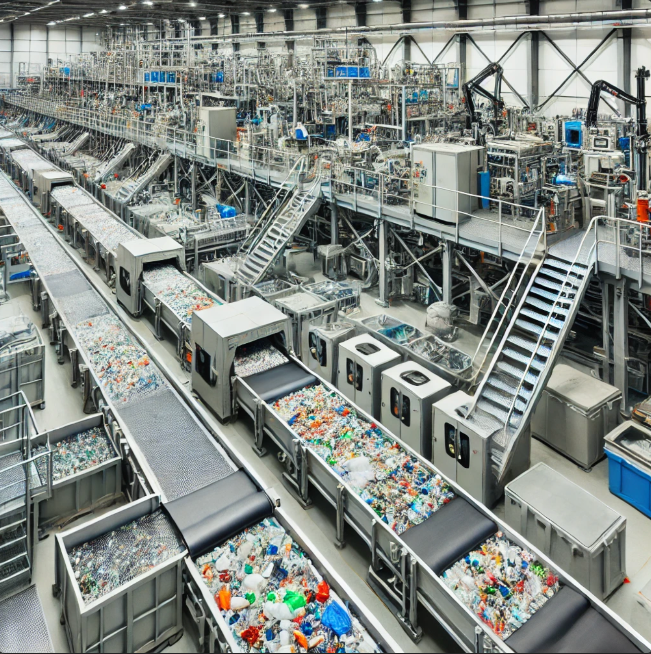 Brief description of the production process (collection, sorting, grinding, depolymerization, condensation, and purification to 98%)